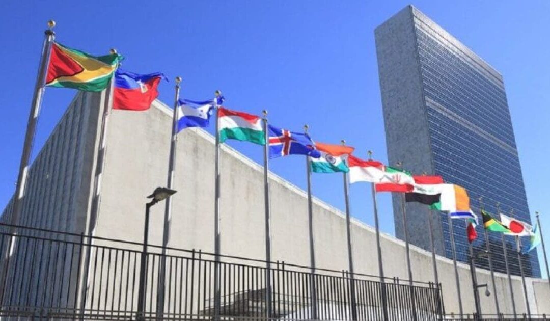 Flags of various nations displayed in front of the United Nations building under a clear blue sky.